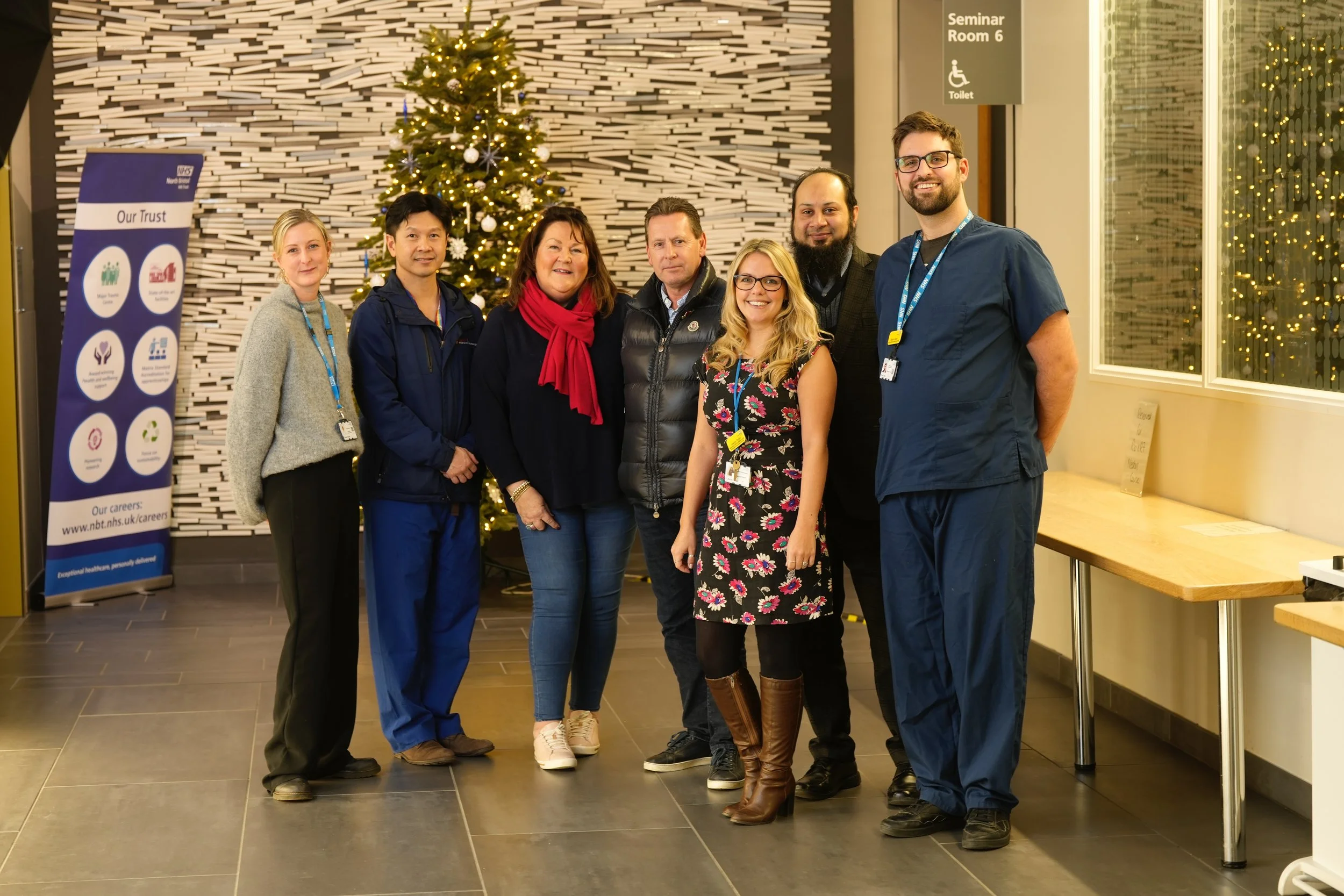 Pictured left to right: Eleanor Brady, Philanthropy & Partnerships Manager, Southmead Hospital Charity, Mr Mario Teo, Consultant Neurosurgeon, North Bristol NHS Trust (NBT), Sophie and Richard Wood, parents of Billie, Laura Timlin, Research Development Lead, NBT, Humza Saeed, Research Facilitator, NBT and Ryan Leese, Vasospasm Research Nurse, NBT